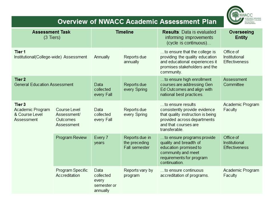 See an overview of NWACC's academic assessment plan which includes assessment tasks,